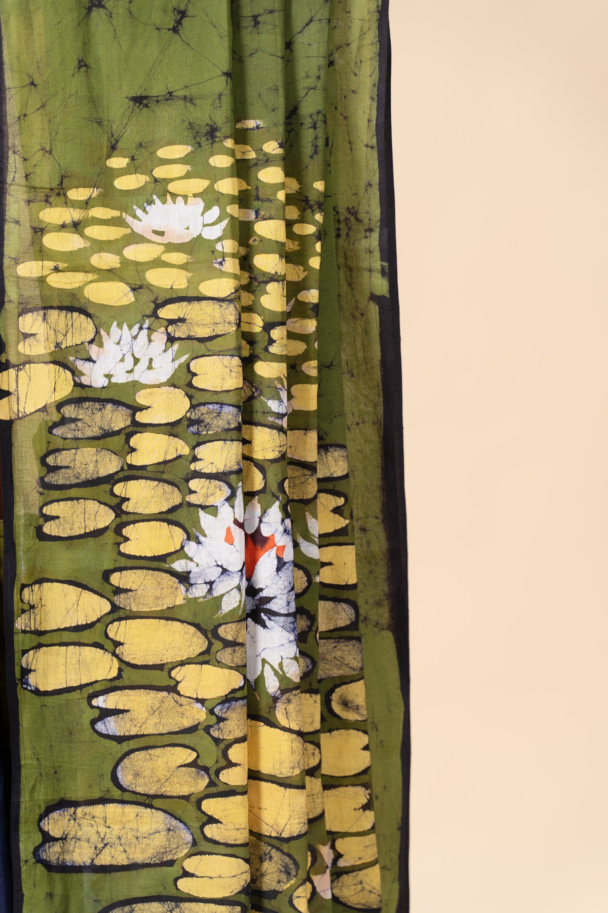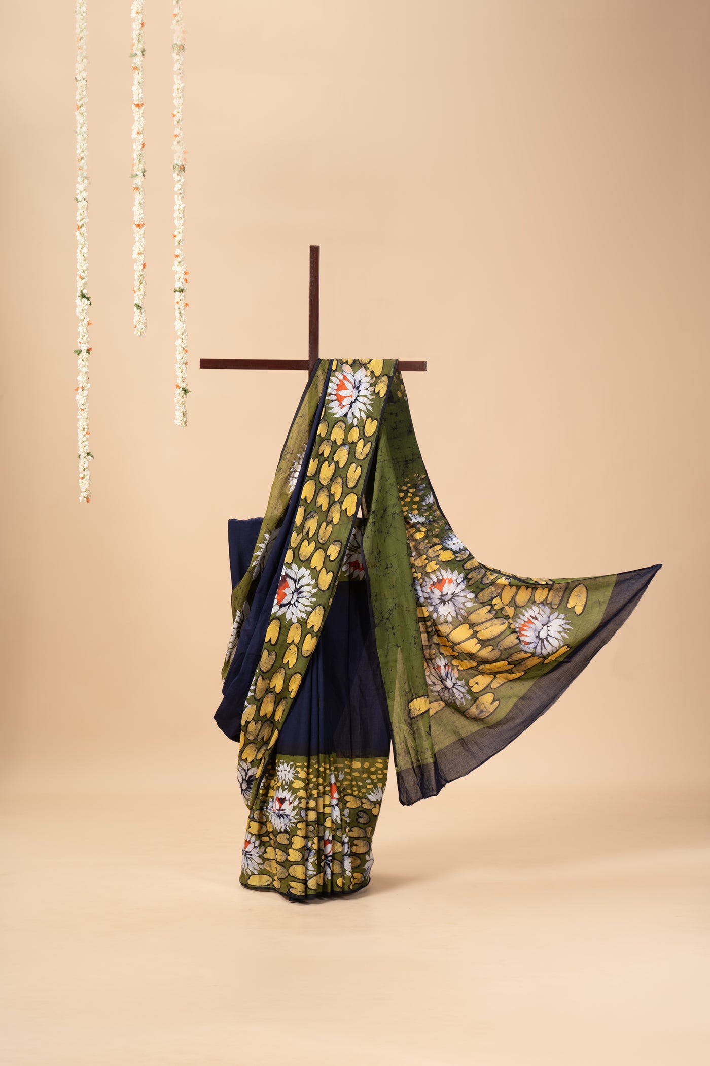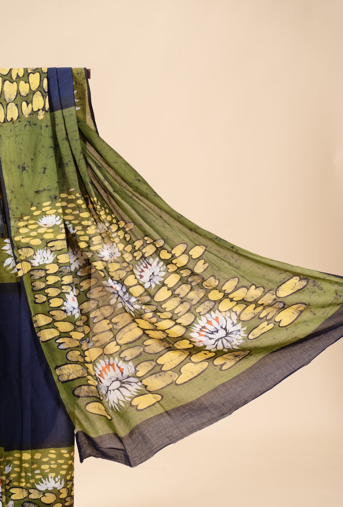 * Hand-painted using the traditional wax batik technique, this saree features intricate motifs created with natural dyes
