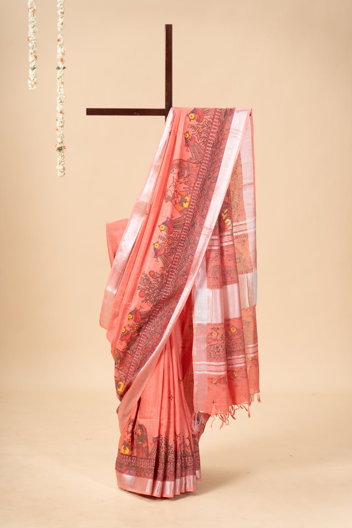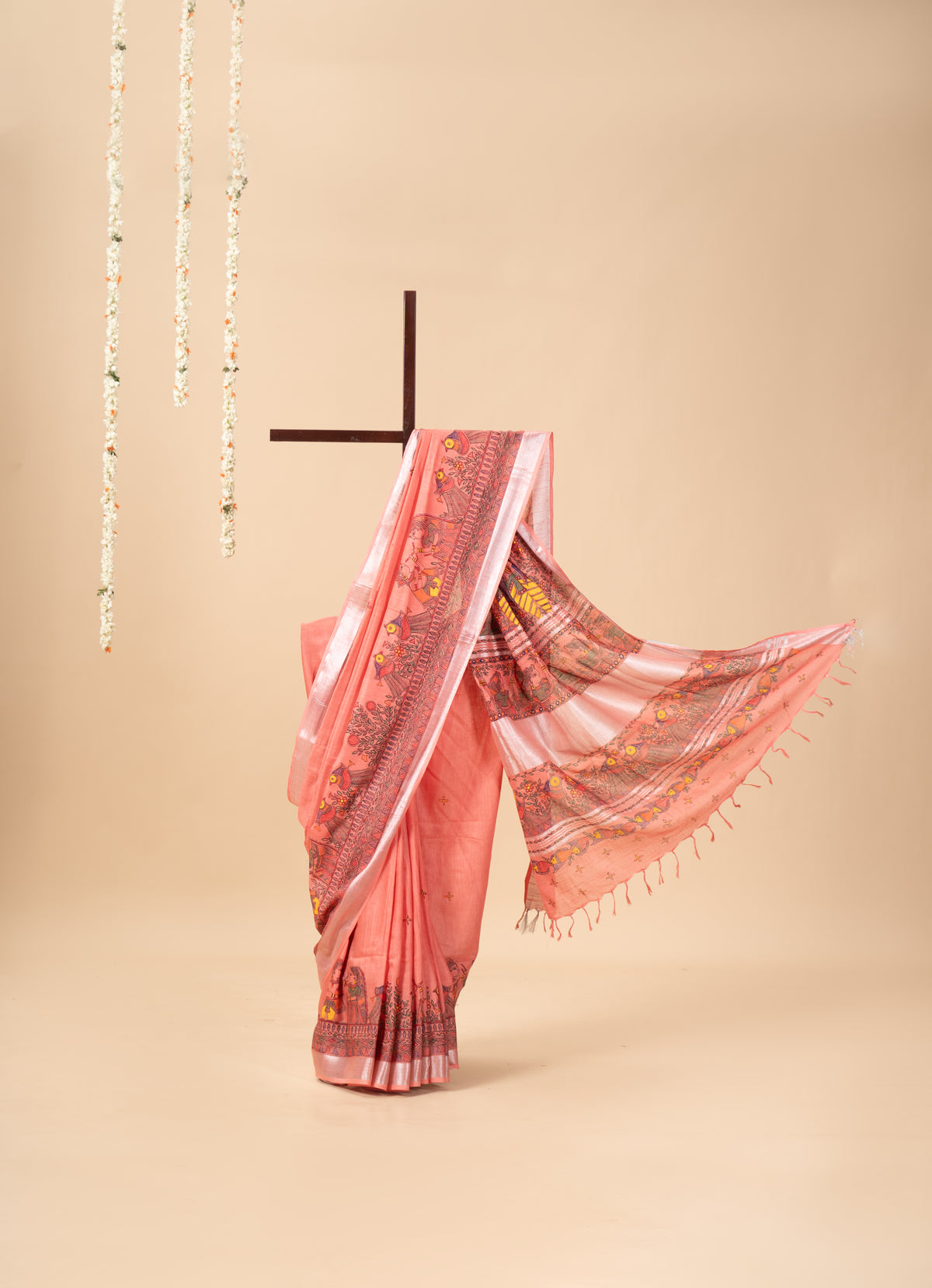 Dristi is a hand-painted Madhubani linen saree inspired by rural life, nature, and timeless folk artistry. Each stroke is crafted with fine brushes and natural pigments, making it a soft, soulful piece of art you can wear with ease