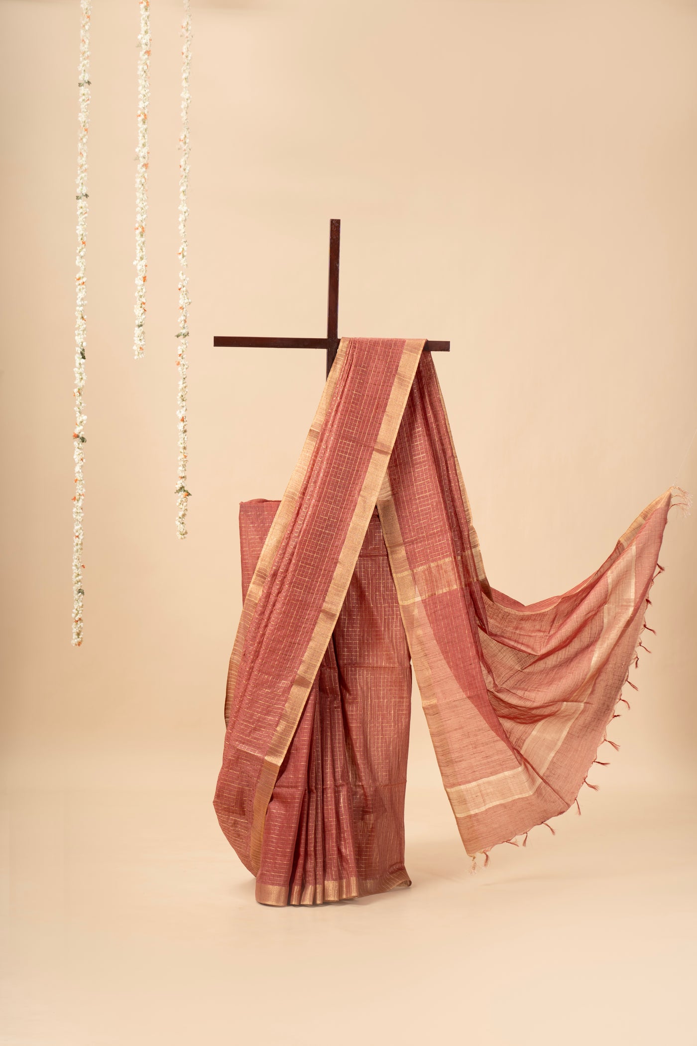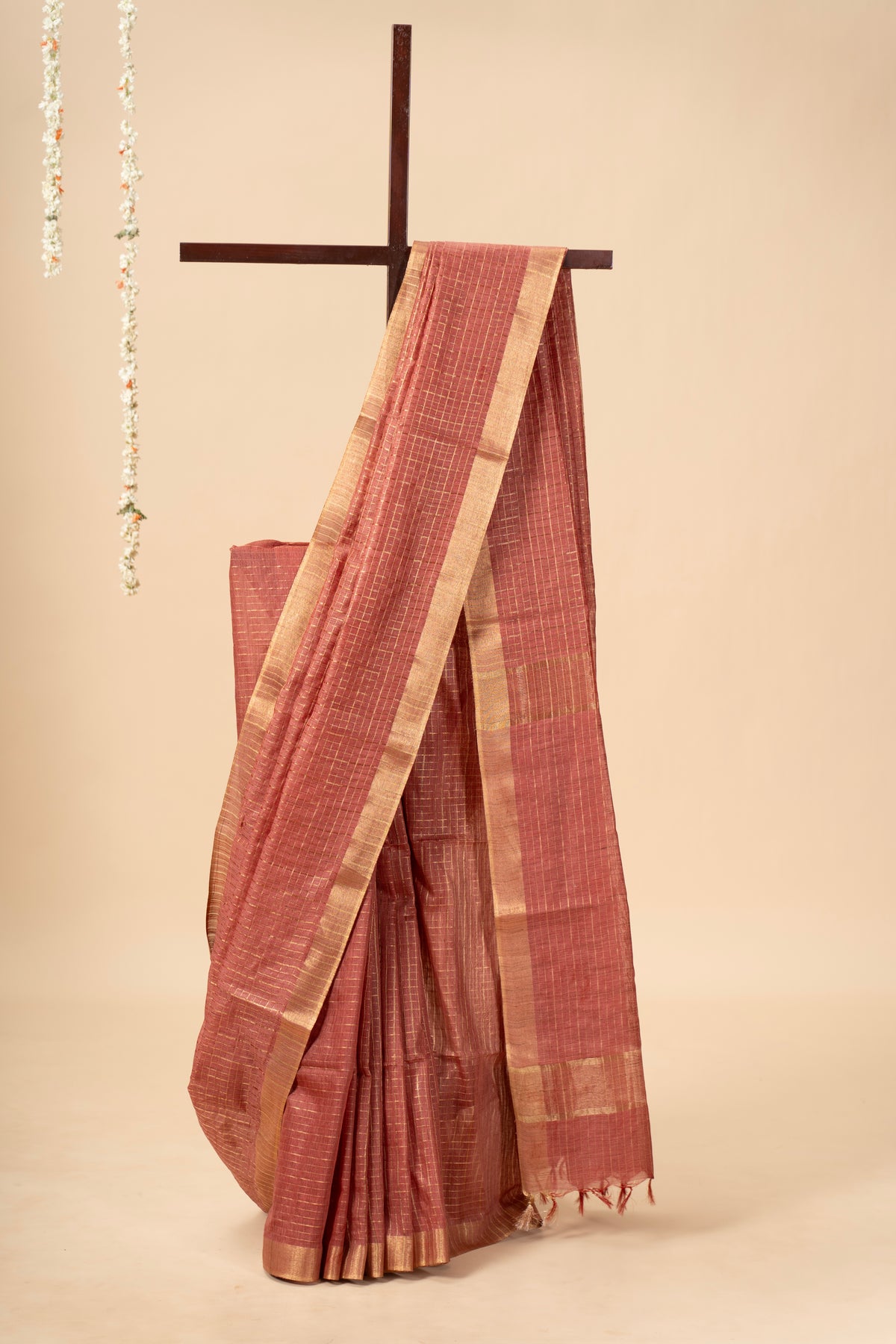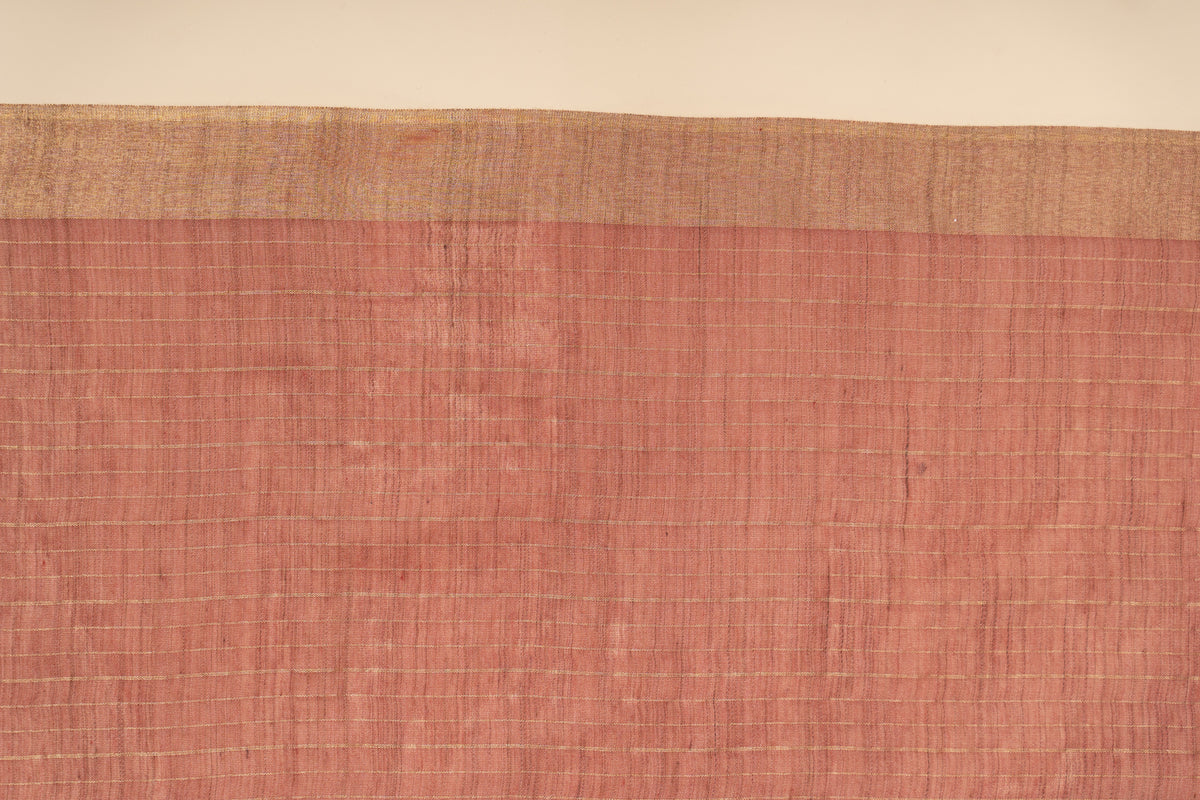 Elegant Tussar silk saree with an all-over zari-checked design and a rich golden border. Lightweight yet regal, its subtle sheen adds charm, making it perfect for festive gatherings, special occasions, or when you want to feel gracefully radiant