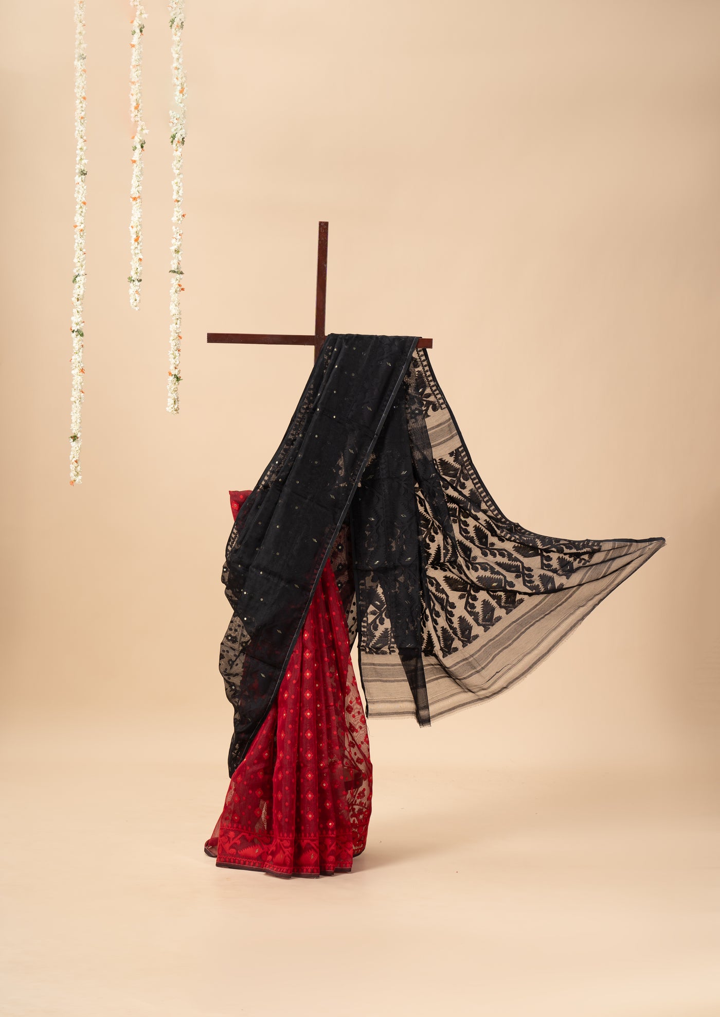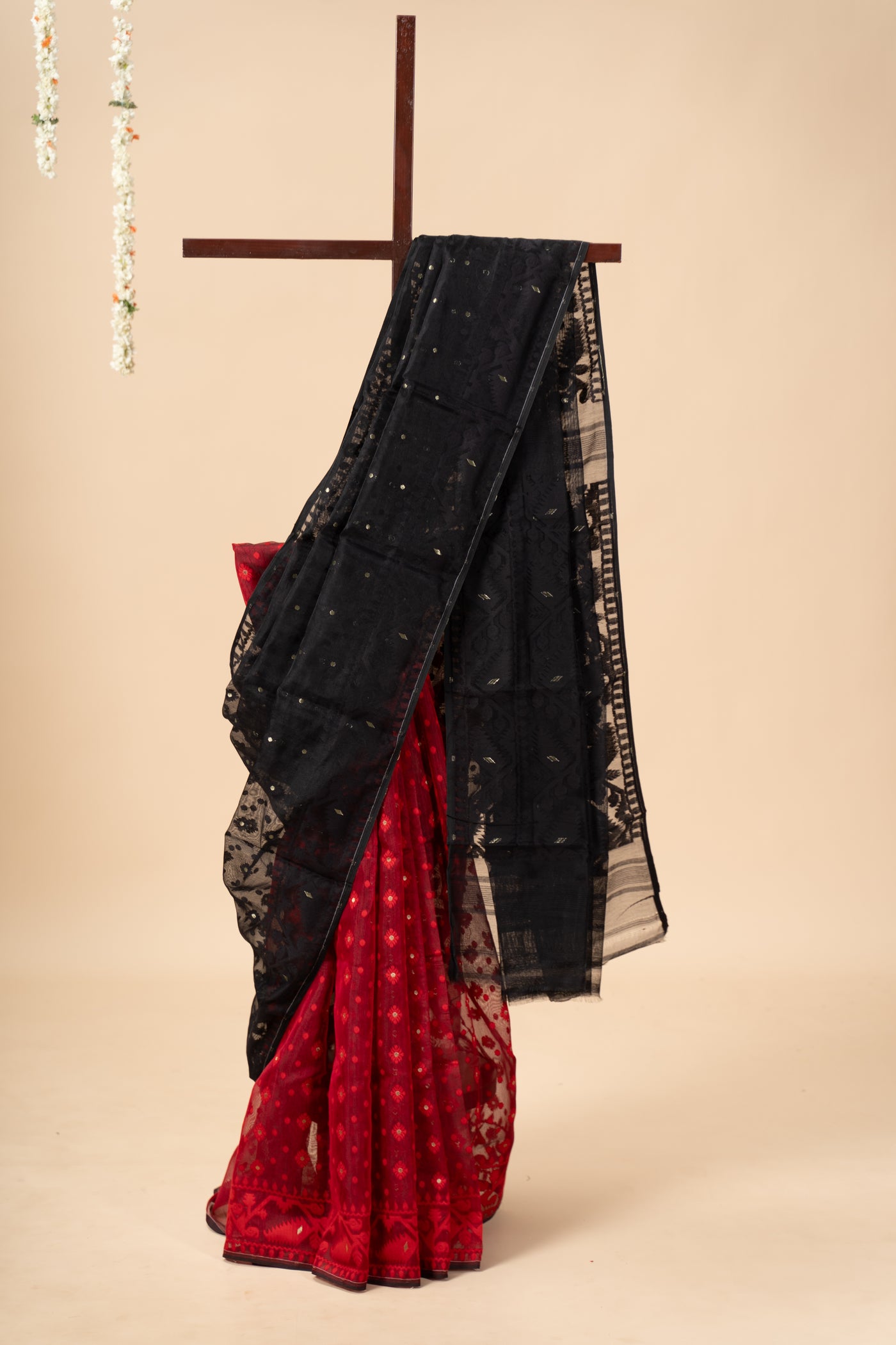 Black and Red Half n Half Saree with Golden Zari
