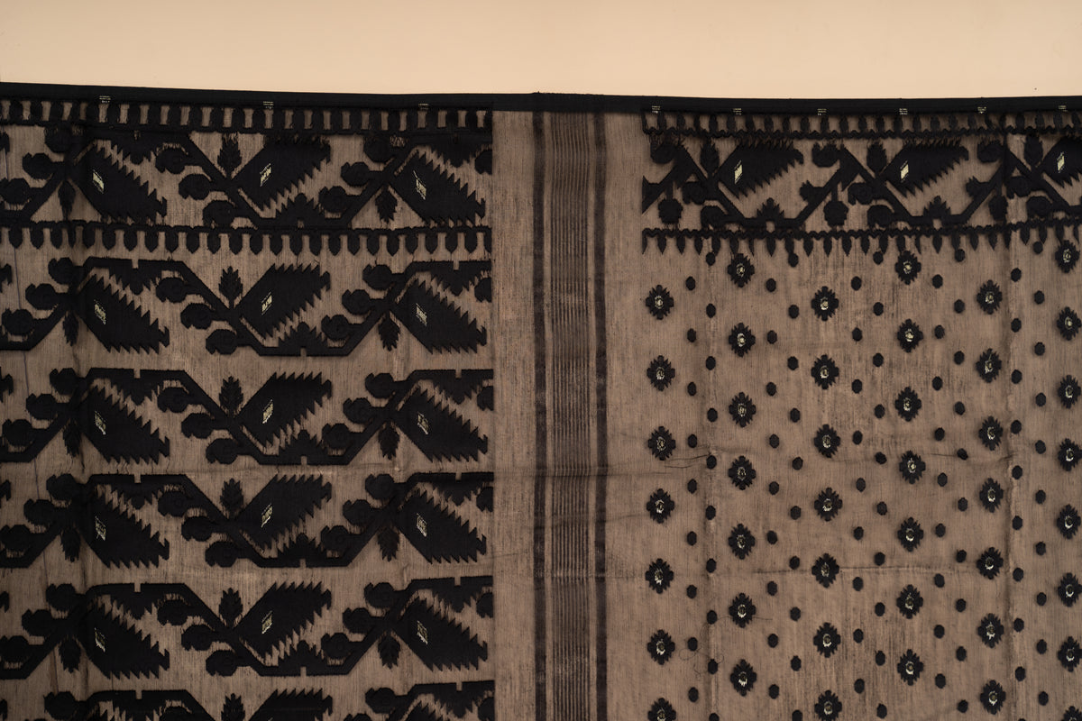 Grahati-Handwoven on premium cotton, this Dhakai Jamdani brings delicate floral and geometric motifs to life with its airy drape. Soft, breathable, and timeless—an easy blend of heritage charm and everyday elegance.